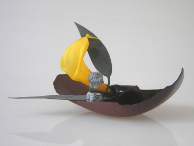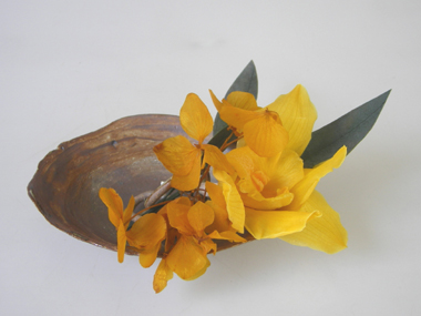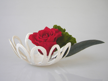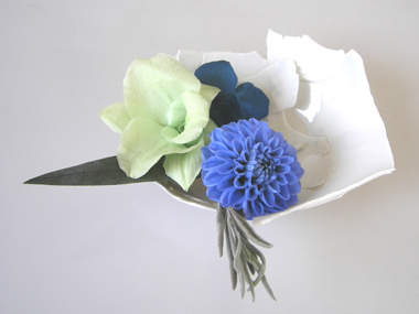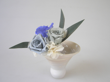 小林千佐子さんとの出会いは、作家活動を初めて間もないころです。国際陶磁器展美濃に出品したものを見初めていただき、作品のフラワーベースに使いたいとご連絡いただきました。華やかで可憐な生花に合うよう、重さを感じさせない薄い陶器になっています。自然の形態と土の色を活かしたものや、花を感じさせる形態で白を基調にした器が、主役の花を引き立てているのではないでしょうか。