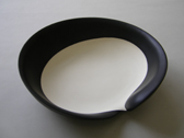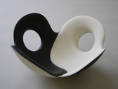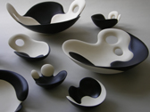 黒と白が強いコントラストを描き、柔らかいラインが踊るように遊ぶデザイン。実用的な器と鑑賞用のオブジェとの中間点位置すると考えています。