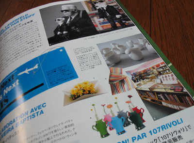 Who's Next what'Next PARISという海外情報を紹介する巻頭ページに、作品の写真とショップの記事があります。パリの装飾美術館のブティック「107リヴォリ」で開催中のJAPON! PAR 107RIVOLI展のことが載っています。