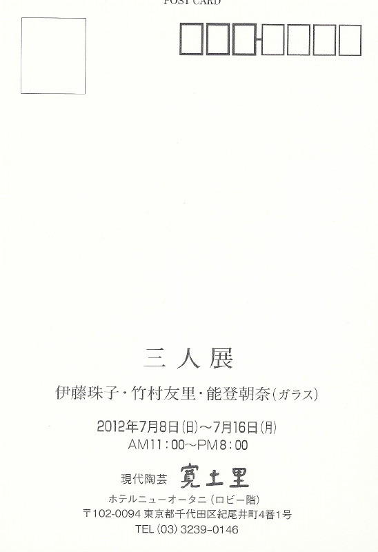 今年で三回目となる現代陶芸寛土里での「三人展」。今回はメンバーが入れ替わり、陶芸とガラス作家による展覧会です。