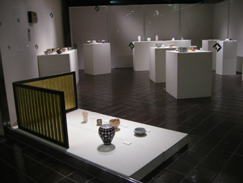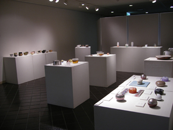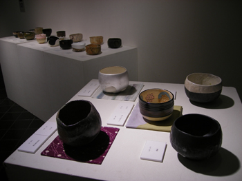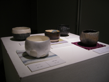 | 展示会場には多くの作品があります。右写真、手前の白(銀色)茶碗が私の作品です。会場ではご希望の方に販売もしました |
