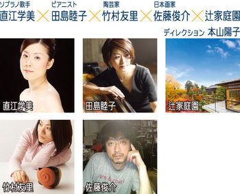 寺町台地に長らく非公開の金沢最後の文化財、国登録の日本家屋と6600?の庭を擁する辻家庭園。この金沢ならではの建築空間に、群青の間に呼応する竹村友里の陶芸作品を展示、気鋭の日本画家 佐藤俊介の六曲一双の屏風を立てまわし、和ろうそくの揺らぐ炎の中、ソプラノ歌手 直江学美、ピアノ 田島睦子による音楽会が幕を開けます。