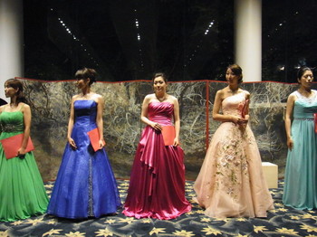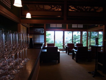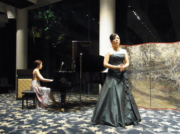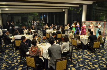 静かな日本庭園に囲まれたバンケットでは日本画家佐藤さんの六曲一双の屏風を立てまわし、和ろうそくの揺らぐ炎の中、ソプラノ歌手直江さんの美しい歌声が響き渡りました。