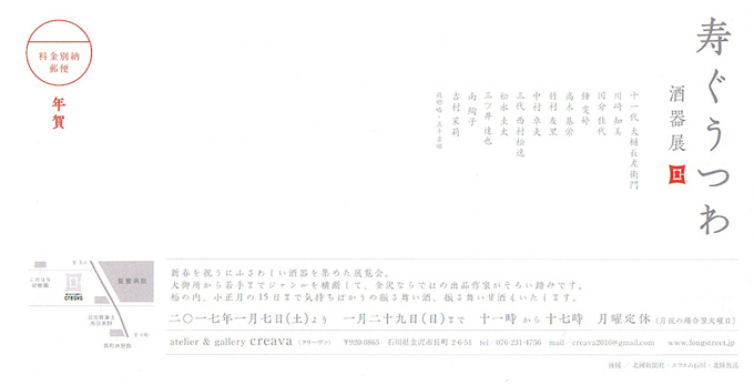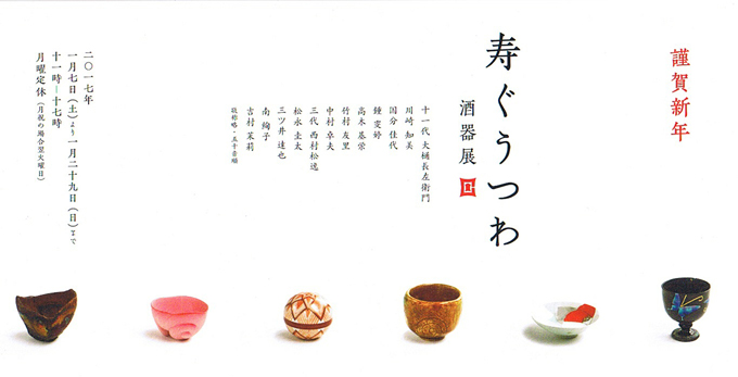 新春を祝うにふさわしい酒器を集めた展覧会を開催します。15日まで気持ちばかりの振る舞い酒、甘酒もいたいます。