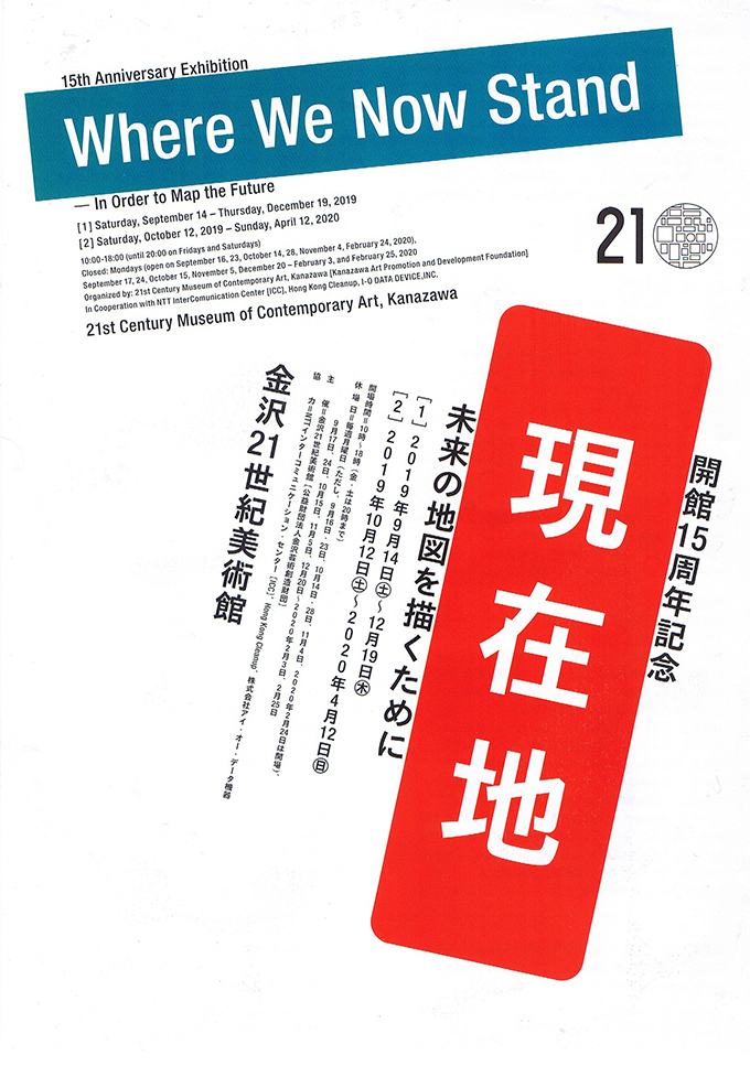 金沢21世紀美術館は2004年の開館から15周年を迎えます。その節目を記念して。展覧会「現在地:未来の地図を描くために」を開催します。本展は、コレクション作品を中心に、私たちの未来を見つめるために立つ、今ここを「現在地」として、時代と供に歩んでいく作家たちの世界への眼差しを捉えて紹介するものです。開館からわずか15年間ではありますが、その間に収集した約4000点に及ぶコレクション作品の数々は、20世紀終わりから21世紀の今日までの目まぐるしく変化する世界について、芸術的な視点から考察することができます。この世界に生きる表現者たちは、どのような未来の地図を手に入れて進んでいくのか。芸術によって認識する、私たちそれぞれの現在地を明らかにしていく機会とします。(金沢21世紀美術館「現在地:未来の地図を描くために」リーフレットより)