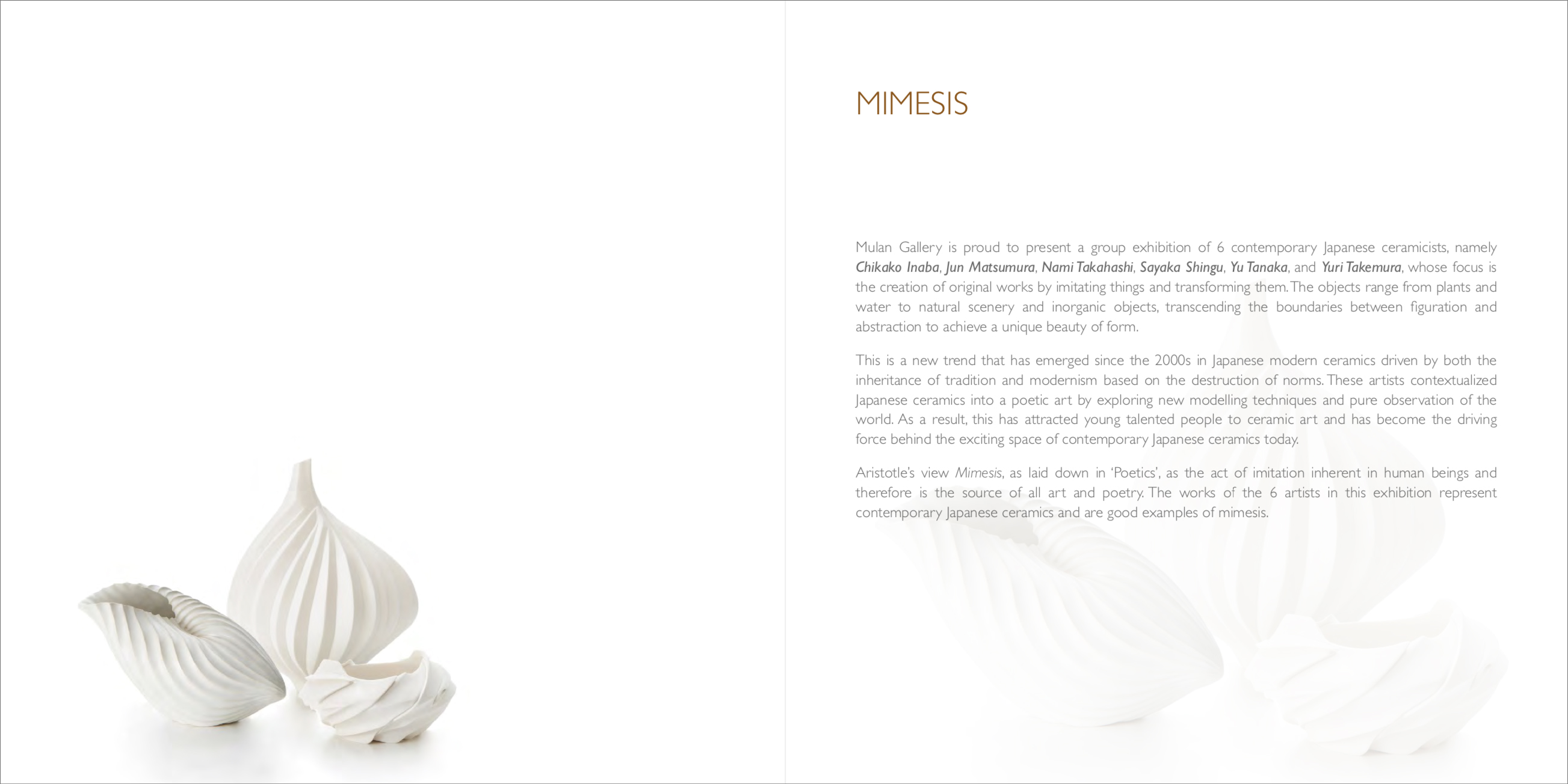 アリストテレスは「詩学」において、人間に備わったミメシス-模倣行為-は、あらゆる詩と芸術の源泉だと語っている。この展覧会において、日本の現代陶芸を代表する6人のアーティストの作中にミメシスの素晴らしい例を見ることができるだろう。