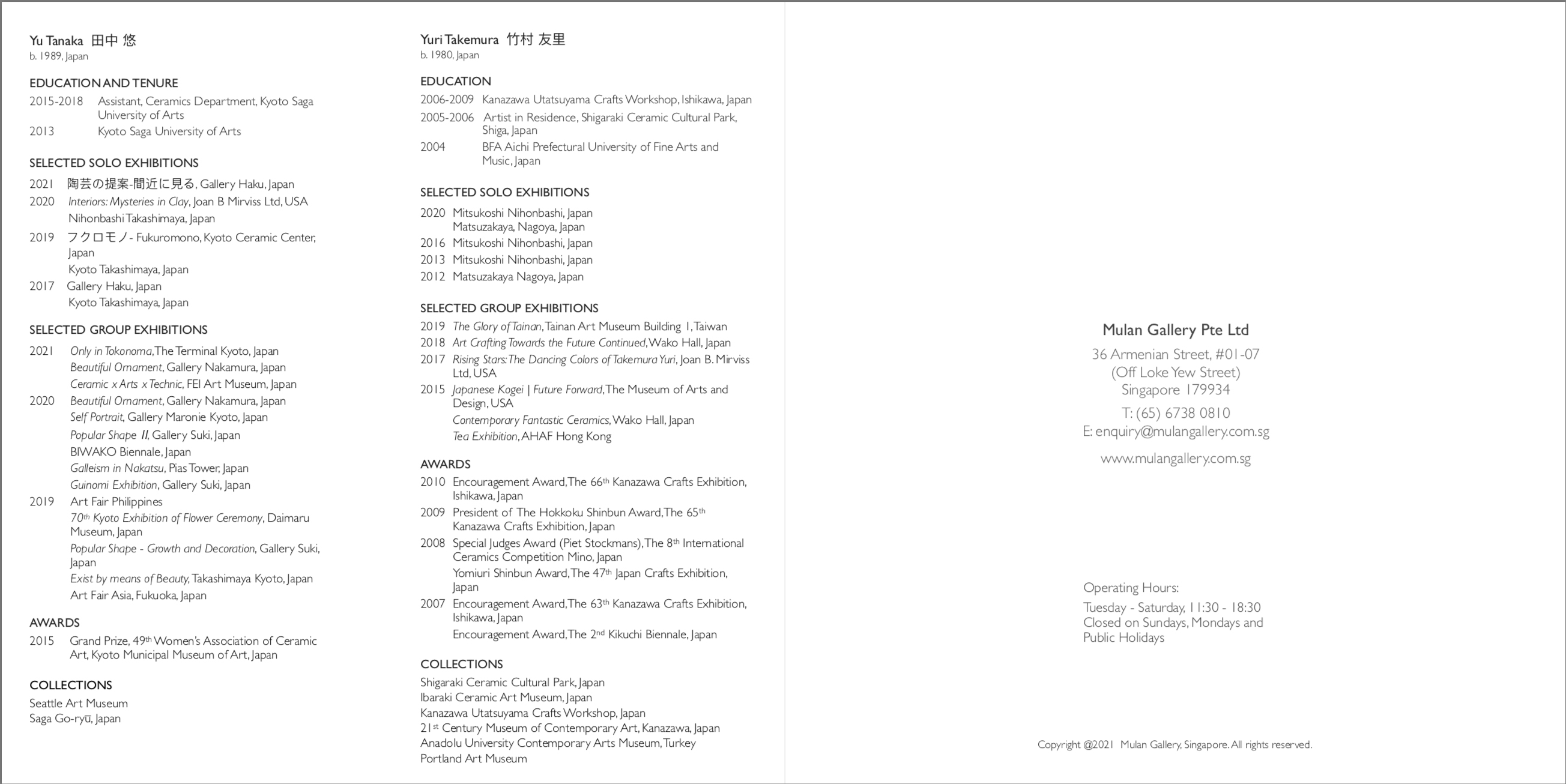 Mulan Gallery is proud to present a group exhibition of 6 contemporary Japanese ceramicists, namely Chikako Inaba, Jun Matsumura, Nami Takahashi, Sayaka Shingu, Yu Tanaka, and Yuri Takemura, whose focus is the creation of original works by imitating things and transforming them. The objects range from plants and water to natural scenery and inorganic objects, transcending the boundaries between figuration and abstraction to achieve a unique beauty of form.
