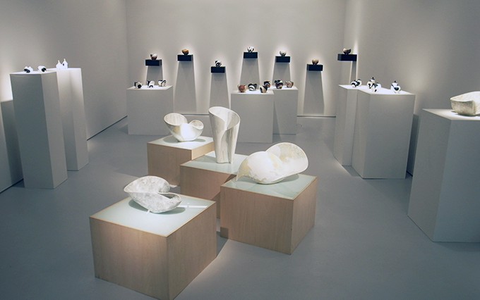 竹村友里の陶の形に見る丸みや曲線は、観る者の心を躍動させる生命力に満ちている。彼女は制作の初期から、弾むような曲面・曲線を武器に、器もオブジェも自由に行き来してきた。とりわけ、2008 年頃からは、その軽快なフォルムで、あっけらかんと茶陶の世界に斬り込んでいく。いかにも現代の陶芸家である。成形には、内型を準備し、型から外して変形し、土を盛り上げる。口もボディも高台も、全てが一体の茶碗は、いわば初めも終わりもないような曲線美に包まれている。時に渦巻く曲線と、曲線に即した土の厚みを、人は思わず手に取り確かめたくなるであろう。しかし今回、その“竹村ポップ”に微かな異変が起きている。わざと荒い土を使い、渋みや土味を表出させる。西洋的な明るさから、東洋的な力強さへ。軽快感から一種の重厚感へ。そこには現在の竹村友里と土との親密な対話があるに違いない。