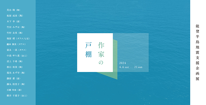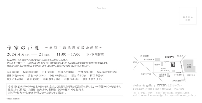 作家の戸棚 〜能登半島地震支援企画展 〜 会場 : atelier & gallery creava 石川県金沢市長町2-6-51 日時:2024年4月6日(土)〜4月21日(日) 11:00〜17:00 休廊日 : 水・木 (入場無料)